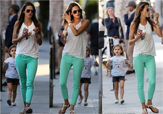 Alessandra Ambrosio was spotted wearing Level 99 jeans while getting ice cream with her adorable daughter, Anja, in Los Angeles over the weekend. While the east coast prepped for the impending hurricane, the supermodel beat the LA heat in her Level 99 Janice Ultra Skinny jeans in Argon Green ($110). Other fans of Level 99 include Jessica Biel & Jennie Garth, both of whom recently spotted in the exact same pair of jeans.